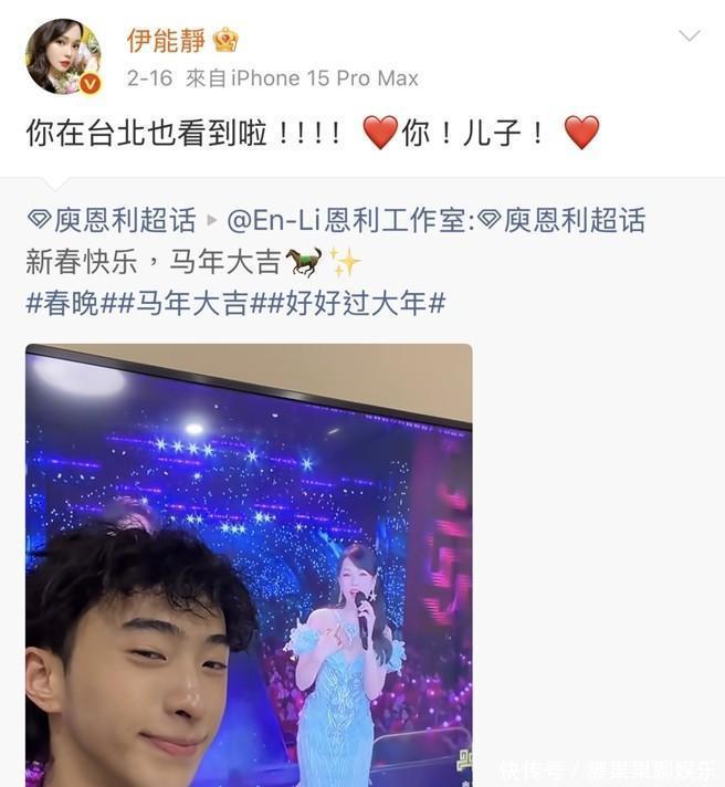 妈妈第一次上春晚,他在社交平台发了一张拼图——伊能静的春晚路透照,旁边拼着他小时候跟妈妈的合影。