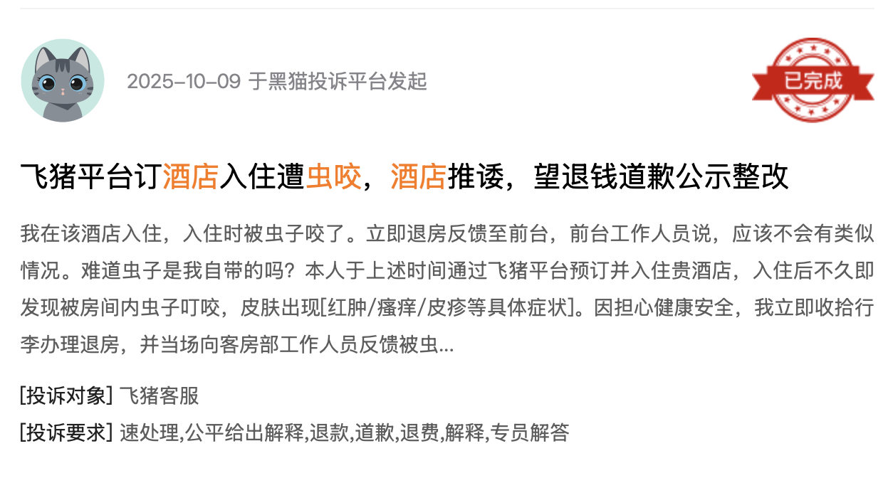 在黑猫投诉平台上,一起关于 “酒店入住遭虫咬,商家推诿后终获全额退款并道歉” 的投诉,是消费者通过有理有据的维权取得圆满结果的典范。