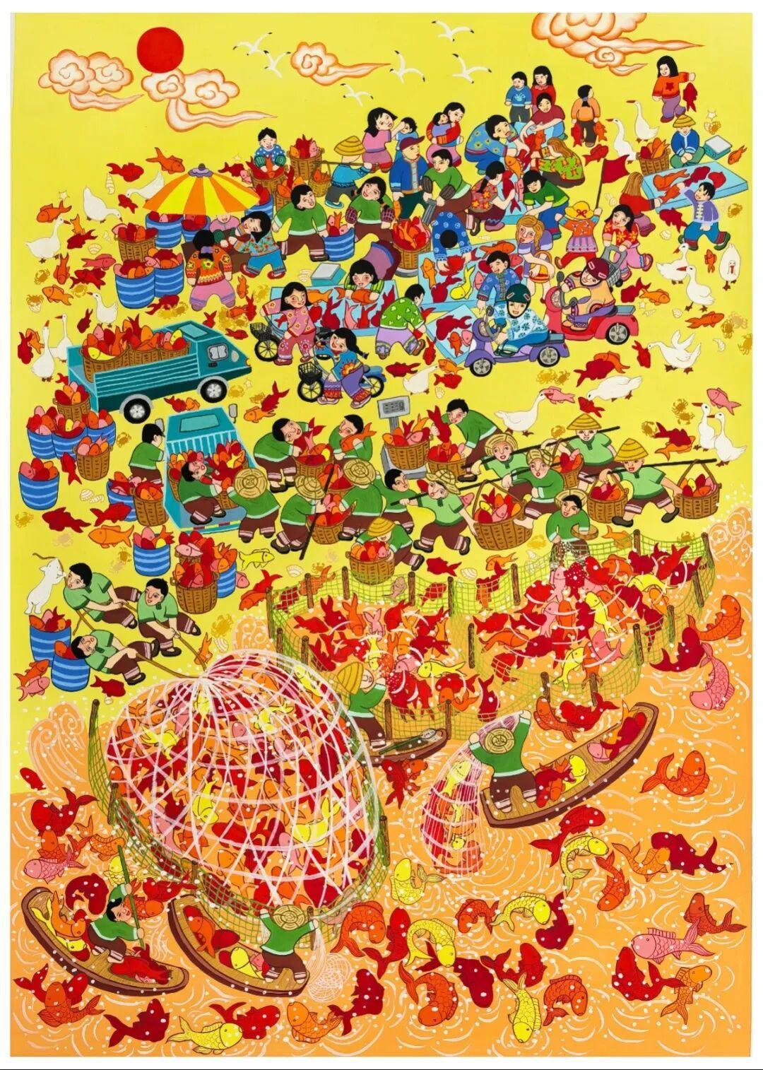 作为“中国现代民间绘画画乡”“中国民间文化艺术之乡”,龙门农民画多年来坚持以浓墨重彩记录生活本真,用质朴笔触传递乡土情怀。此次入选的4幅作品,延续了当地农民画色彩明艳、构图饱满的艺术特色,既聚焦岭南农事节庆、渔乡市集等传统题材,又融入新时代乡村振兴的鲜活气息,把劳动的喜悦、丰收的盛景和群众对美好生活的向往,实实在在地画在了纸上,成为岭南民俗文化的生动写照。